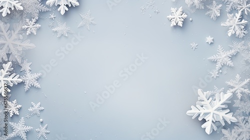 a delicate frame made of snowflakes in pastel gray tones, evoke a winter concept and be presented in a flat lay style with a top view, ample copy space to convey the holiday message.