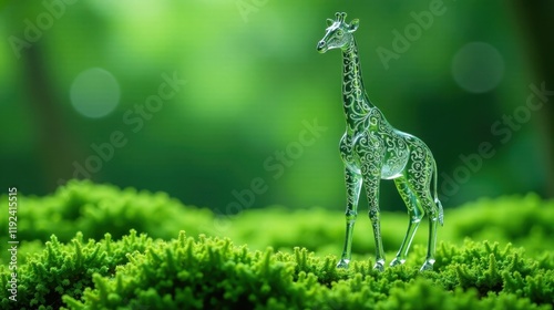 A delicate glass giraffe figurine, adorned with intricate swirling patterns, stands gracefully amidst a vibrant expanse of lush green moss, evoking a serene and natural ambiance.