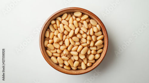 A delicate macro shot of pine nuts arranged in a small ceramic dish