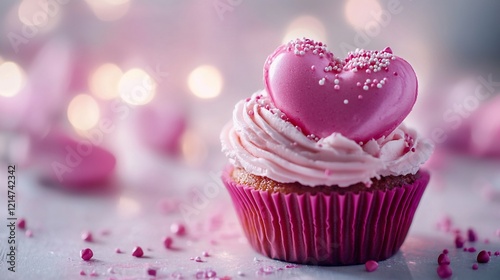 A delicate pink cupcake with a heart-shaped topping rests against a bokeh background