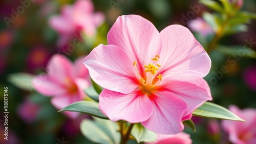 A Delicate Pink Flower with Yellow Stamens in Full Bloom, Surrounded by Lush Green Foliage