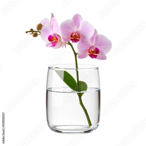 A delicate pink Phalaenopsis orchid sprig with blooming flowers and unopened buds arranged in a clear glass tumbler of water.