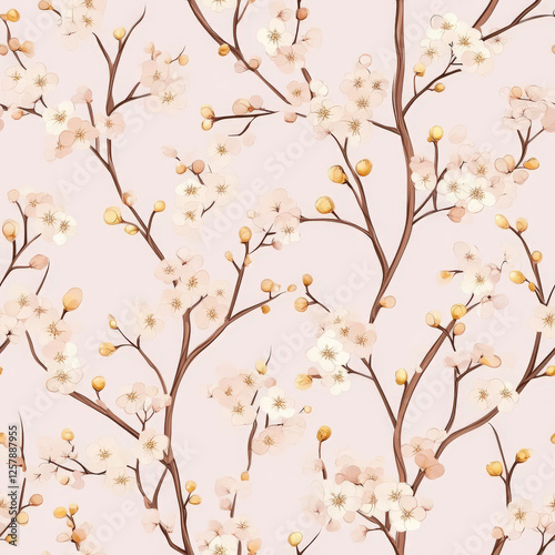 A delicate plum blossom pattern with golden branches and soft pink flowers