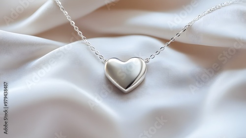 A delicate silver heart necklace on a white fabric background, captured in a soft focus close-up shot, showcasing its minimalist style and dainty chain with macro details.