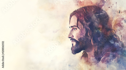 A delicate watercolor painting of Jesus, with soft pastel washes blending into the paper, creating a luminous and peaceful presence, with copy space