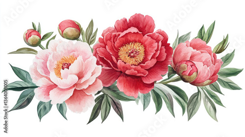 watercolor, painting, peony, pink, crimson, flower, floral, arrangement, botanical, blossom, bloom, flower petals, leaf, green, delicate, soft, romantic, elegant, beauty, springtime, nature, art, illustration, design, wedding, invitation, stationery, card, print, feminine, pastel, vibrant, lush, high-coloured, artistic, picturesque, graceful, exquisite, charming, pretty, beautiful, floral pattern, artwork, floral arrangement
