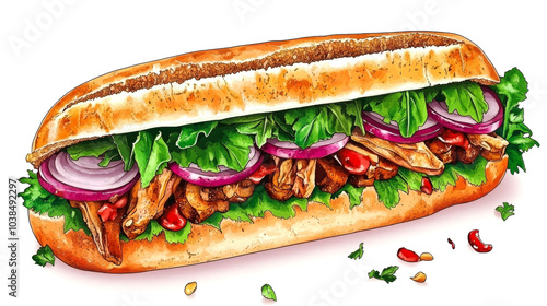 A delicious and hearty sub sandwich with pulled pork, red onions, and peppers.