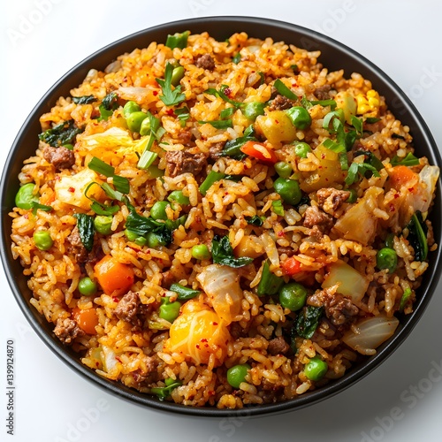 fried rice, kimchi, rice, ground beef, pea, carrot, korean food, asian cuisine, food, receipe, cooking, dish, meal, dinner, lunch, tasty, delicious, savoury, spicey, vibrant, colourful, healthy, home cooking, ingredient, cookery, culture, eat, appetence, deliciously, fresh, vegetable, meat, bowl, plate, background, white background, studio shot, topview
