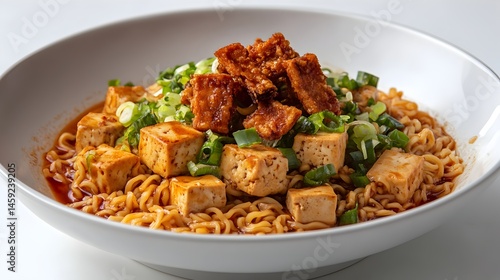 ramen, noodle, tofu, spicey, food, asian cuisine, cookery, bowl, dish, meal, dinner, lunch, receipe, cooking, ingredient, eatery, tasty, delicious, appetising, healthy, vegetarian, vegan, crispy, crunchy, garnish, green onion, scallion, broth, soup, comfort food, hot, savoury, oriental, food photography