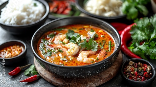 A delicious bowl of Thai Tom Yum soup filled with prawns and rice, bursting with exotic flavors.