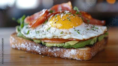 A delicious breakfast of avocado toast topped with a perfectly cooked sunny-side-up egg, garnished with herbs, offering a flavorful start to the day.