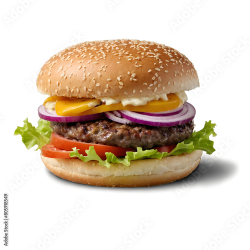 A delicious cheeseburger with fresh pickles, onion, tomato, and lettuce. Transparent background.