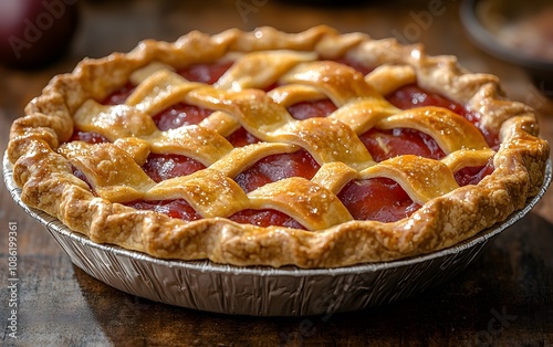A delicious cherry pie with a golden lattice crust, perfect for dessert or special occasions.