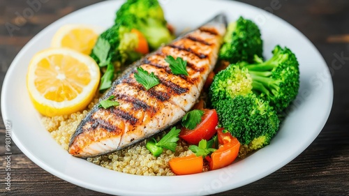 A delicious grilled fish dish served with fresh vegetables and quinoa on a rustic wooden background.