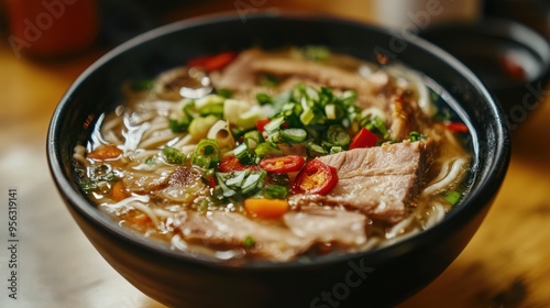 A delicious noodle soup with pork ribs and vegetables in a black bowl, resting on a wooden table, ready to be enjoyed