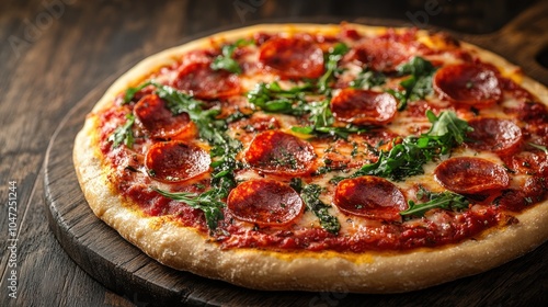 A delicious pepperoni pizza topped with fresh greens, served on a wooden board.