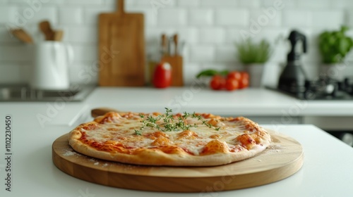 A delicious pizza topped with fresh herbs sits on a wooden board in a bright, contemporary kitchen. The clean background features kitchen utensils and fresh ingredients, adding a homely, appetizing