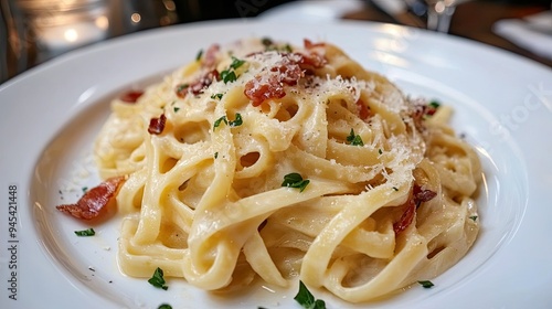 A delicious plate of fresh pasta carbonara with crispy pancetta, parmesan, and a creamy sauce, garnished with parsley