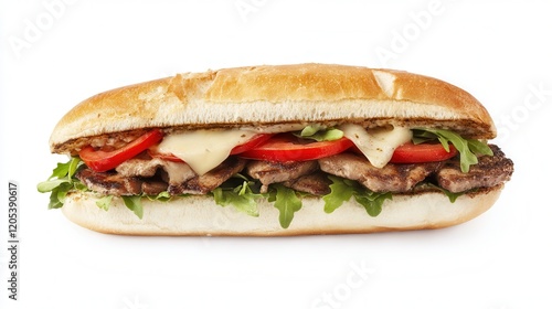 A delicious sandwich filled with savory meat, fresh tomatoes, and crisp lettuce, presented on a clean plate for an appetizing appeal.