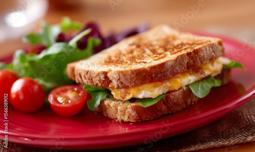 A delicious sandwich in red Plate, simple in the background, Generative AI