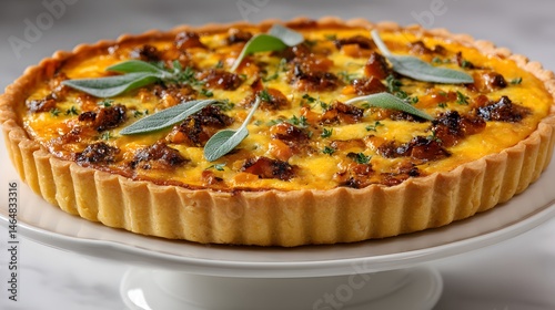 A delicious savory mushroom and cheese quiche sits on a white cake stand ready to be served for a delightful meal.
