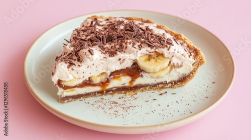A delicious slice of banoffee pie with chocolate shavings, banana slices, and caramel drizzle, placed on a soft pastel-colored plate.