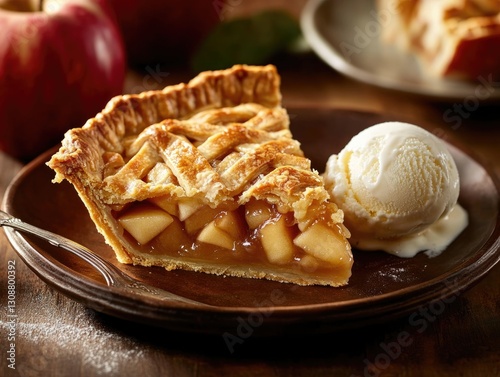 dessert, sweet, apple, pie, slice, pastry, crust, lattice, filling, fruit, ice, cream, vanilla, scoop, plate, wooden, table, fork, food, delicious, baked, gold, brown, warm, closeup, background, traditional, homemade, autumn, comfort, meal, tasty, appetising, cooked, seasonal, sugary, refreshment, treat, favor, texture, buttery, ripe, crisp, simple, serving, portion