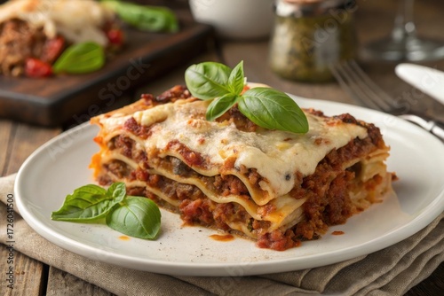 A delicious slice of lasagna with beef and cheese on a rustic table