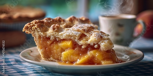 pie, peach, slice, dessert, sweet, food, fruit, baked, homemade, pastry, crust, table, plate, rustic, fresh, delicious, closeup, breakfast, dinner, lunch, comfort food, bakery, traditional, gold, warm, juicy, summer, sugar, icing, powdered, hot drink, cup, steam, floral, vintage, pattern, gingham, textile, ripe, fall, harvest, season, treat, hand-made, soft, flavorful, epicure, still life, background