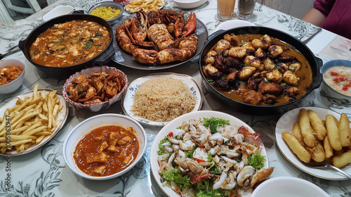 A delicious spread of Ramadan dishes! The table is filled with favorites like crab soup, tofu salad, samosas, grilled chicken, chicken curry, and fries with sauce.