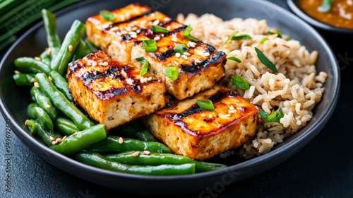A delicious vegan dish featuring grilled tofu, brown rice, and green beans, perfectly garnished and served in a black bowl.