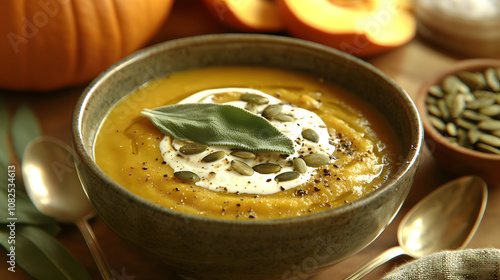 creamy, pumpkin, soup, velveting, cream, toasted, seed, crispy, sage, rustic, bowl, spoon, ingredient, fresh, autumn, cosy