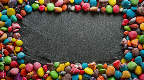 A delightful array of colorful sweets and candies forming a frame on slate, where you can write your message.