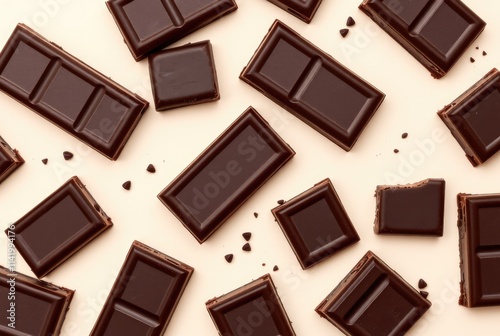 A delightful assortment of dark chocolate bars beautifully scattered across a light cream backdrop, showcasing their glossy surfaces and enticing textures