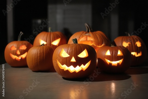 A Delightful Collection of Halloween Pumpkins with Spooky Faces Illuminated from Within for Festive Celebrations