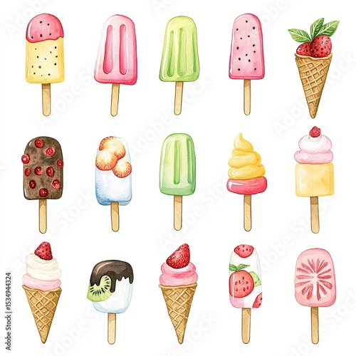 A delightful collection of watercolor ice pops and ice cream cones, showcasing various fruity flavors and toppings