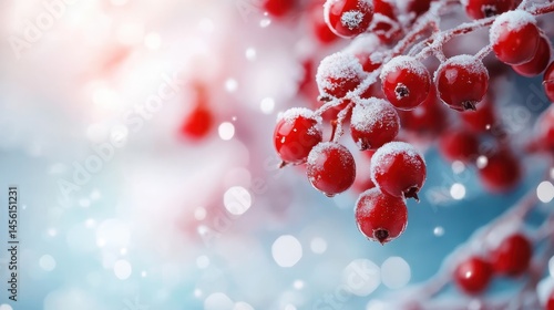 A delightful display of red berries coated in frost, contrasting beautifully against a cool, soft background, reminiscent of holiday cheer and winter's charm.