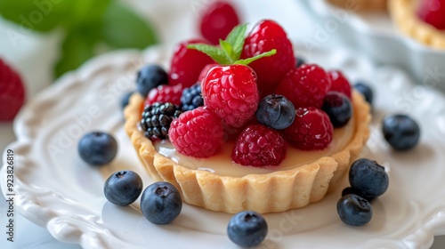 A delightful mini fruit tart topped with fresh berries and a light glaze