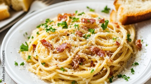 delightful, plate, spaghetti, carbonara, crispy, egg, parmesan, cheese, arranged, attractively, freshly, cracked, black, pepper, top, chopped, parsley, garnish, garlic, bread, slice, dipping