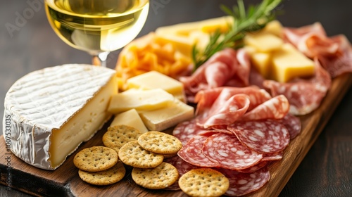 A delightful spread of gourmet cheese, cured meats, and crackers with a glass of white wine ready for enjoyment