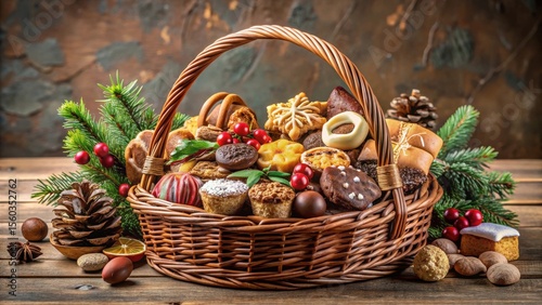 A delightful wicker basket overflowing with an assortment of sweet holiday treats, adorned with festive evergreen boughs and pinecones, creating a cozy and delicious winter scene.