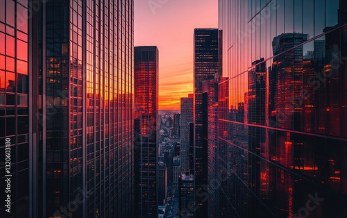 A dense metropolis with skyscrapers reflecting the bold red hues of the setting sun, giving the city an electric and intense energy