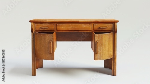 A desk with its drawers slightly open, looking like a mouth gasping in shock, positioned on a seamless white background.