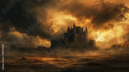 A desolate castle at the center of a barren landscape, with dark clouds swirling ominously overhead.