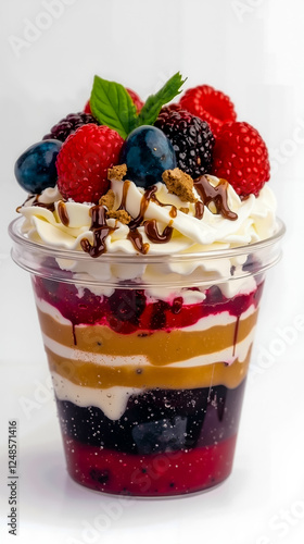 dessert, plastic, cup, whipped, cream, berry, chocolate, sauce, fruit, raspberry, blueberry, blackberry, strawberry, cheese, layered, parfait, topping, garnish, sprig, mint, sweet, healthy, snack, treat, bowl, filled, red, black, white, generous, dollop, drizzle, few, fresh, scattered, milkshake, straw, ice, sprinkle, banana, caramel, grain, granola, yogurt, smoothie, colourful, alimentary