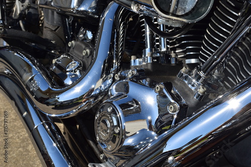 A detail of the motorbike body parts with shining iron color in the sun