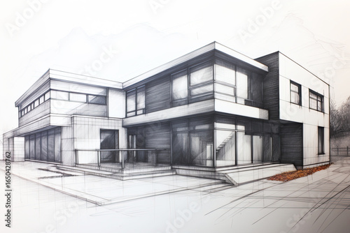 A detailed architectural sketch of a modern building featuring clean lines, large windows, and a minimalist design.