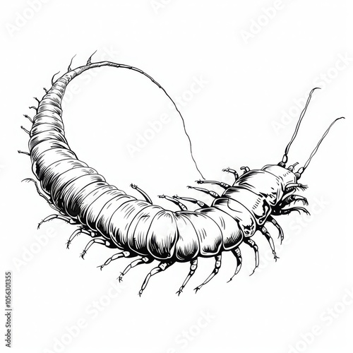 centipede, illustration, black, white, insect, arthropod, leg, drawing, art, nature, animal, creepy, crawly, bug, wildlife, zoology, entomology, science, biology, anatomy, realistic, detailed, vignetting, line, graphic, design, abstract, pattern, texture, monochrome, silhouette, shape, form, isolated, background, vector, vintage