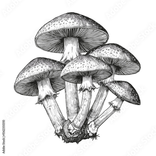 A detailed black and white illustration of a cluster of mushrooms, showcasing intricate textures and botanical detail.