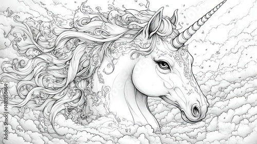 A detailed black and white illustration of a unicorn in a dreamy cloudscape.